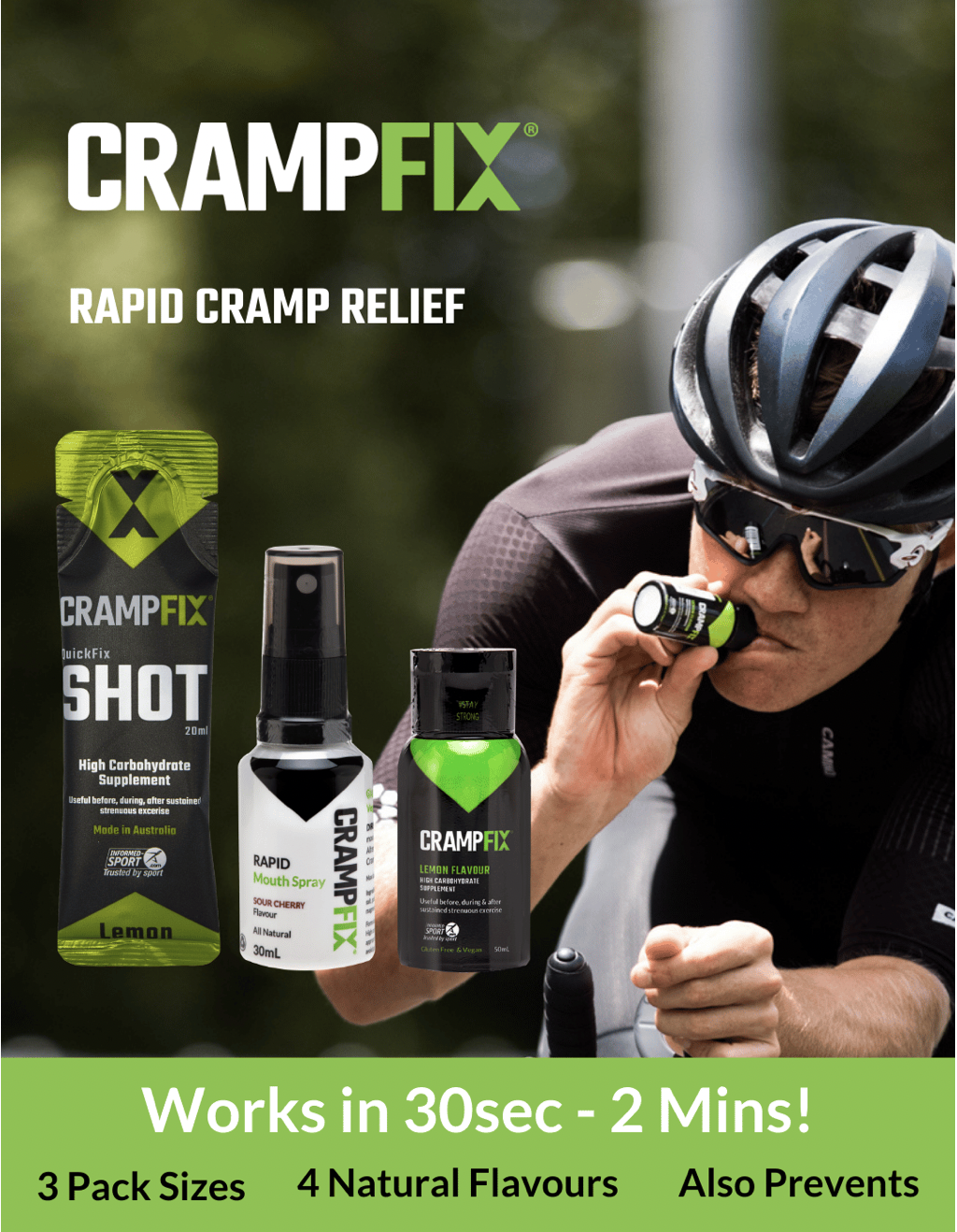 After almost two years of further testing and tweaking, the all-natural CrampFix® was brought to market for professional athletes. Crampfix is used by many professional sports teams outside running, including many cycling teans, the Wallabies national rugby team, UK Cricket & Football and the South African Springboks, world champions in rugby. The range also includes a product for rapid relief of non-exercise related muscle cramps.